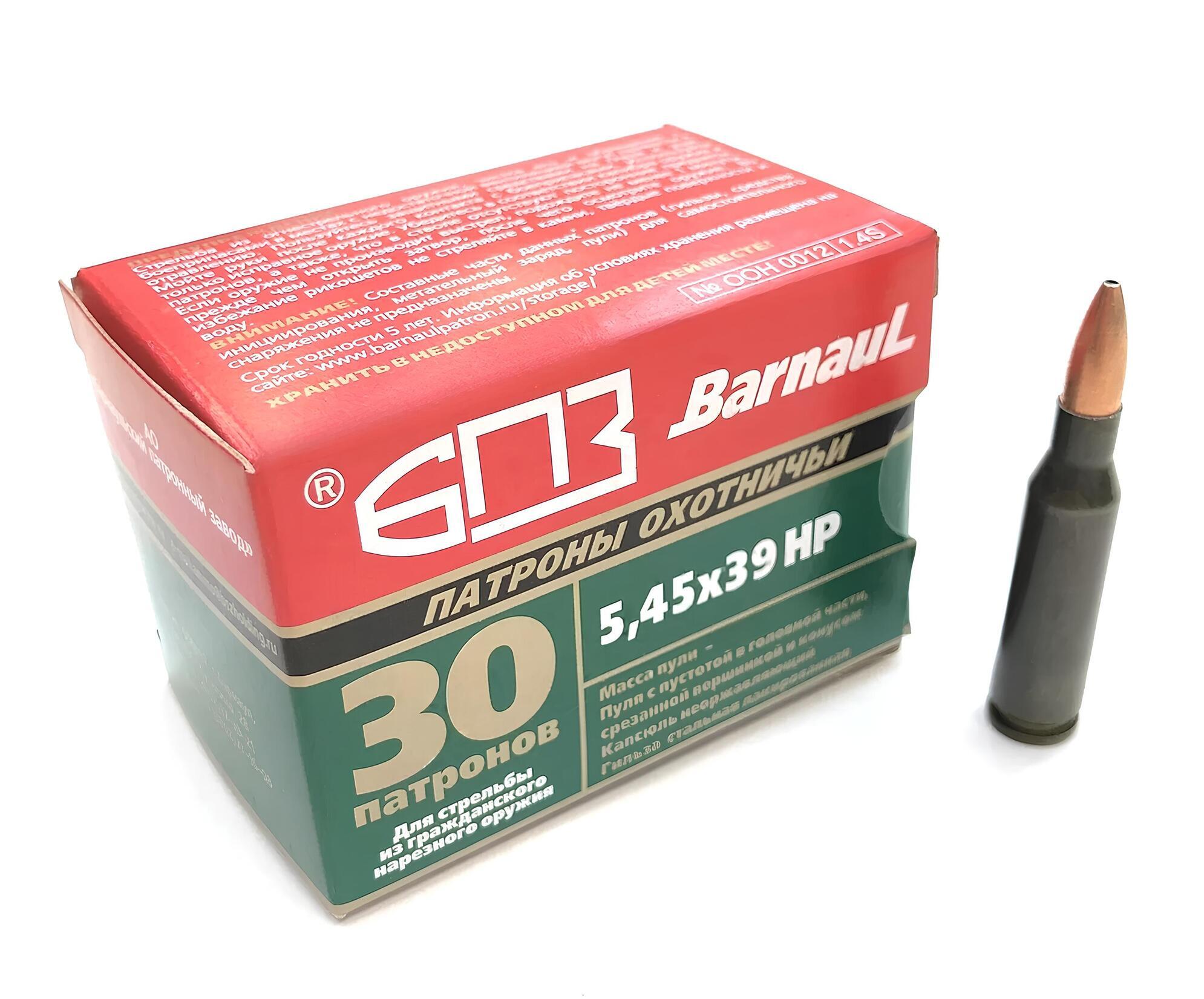 5,45×39 мм — созданный российскими оружейниками как конкурент американскому.223 Remington, этот патрон отличается высокой начальной скоростью, хорошим останавливающим действием и высокой настильностью траектории. Обладает малой отдачей, что улучшает кучность стрельбы. Однако, несмотря на свои достоинства, склонен к рикошетированию, поэтому использовать его следует с осторожностью. Вес пули составляет 3,61 грамма.